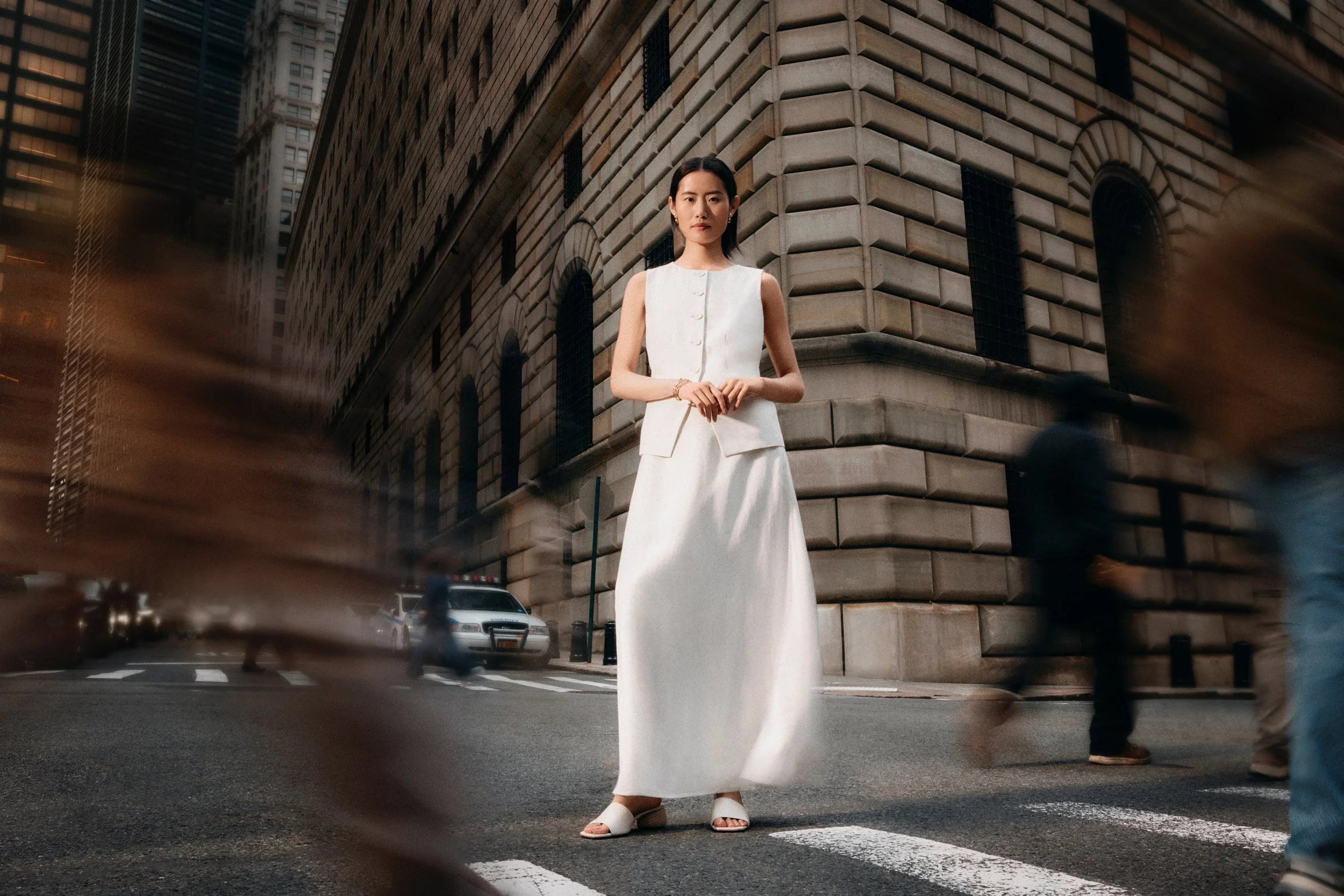 A woman in a sleeveless white dress and sandals standing on a city street crosswalk, with blurred pedestrians and a historic building in the background.