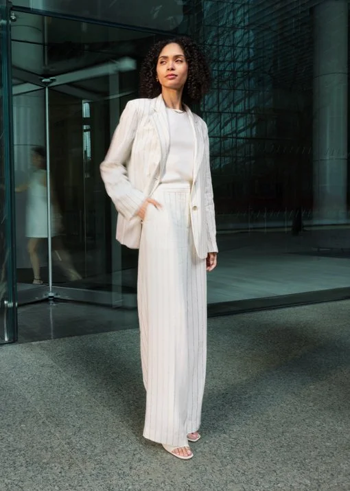 A woman stands confidently outside a modern office building, wearing a white pinstripe pantsuit with a blazer and wide-leg trousers, and open-toe heels.