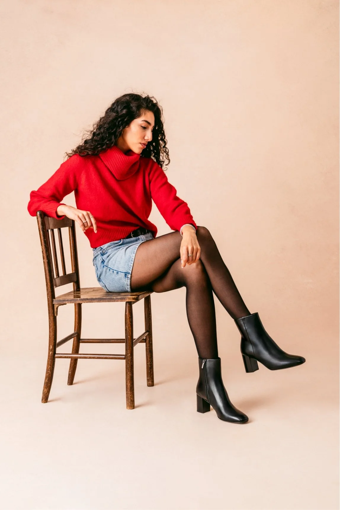 A woman sitting on a wooden chair wearing a red sweater, denim shorts, black tights, and black ankle boots. She has curly dark hair and is looking down.