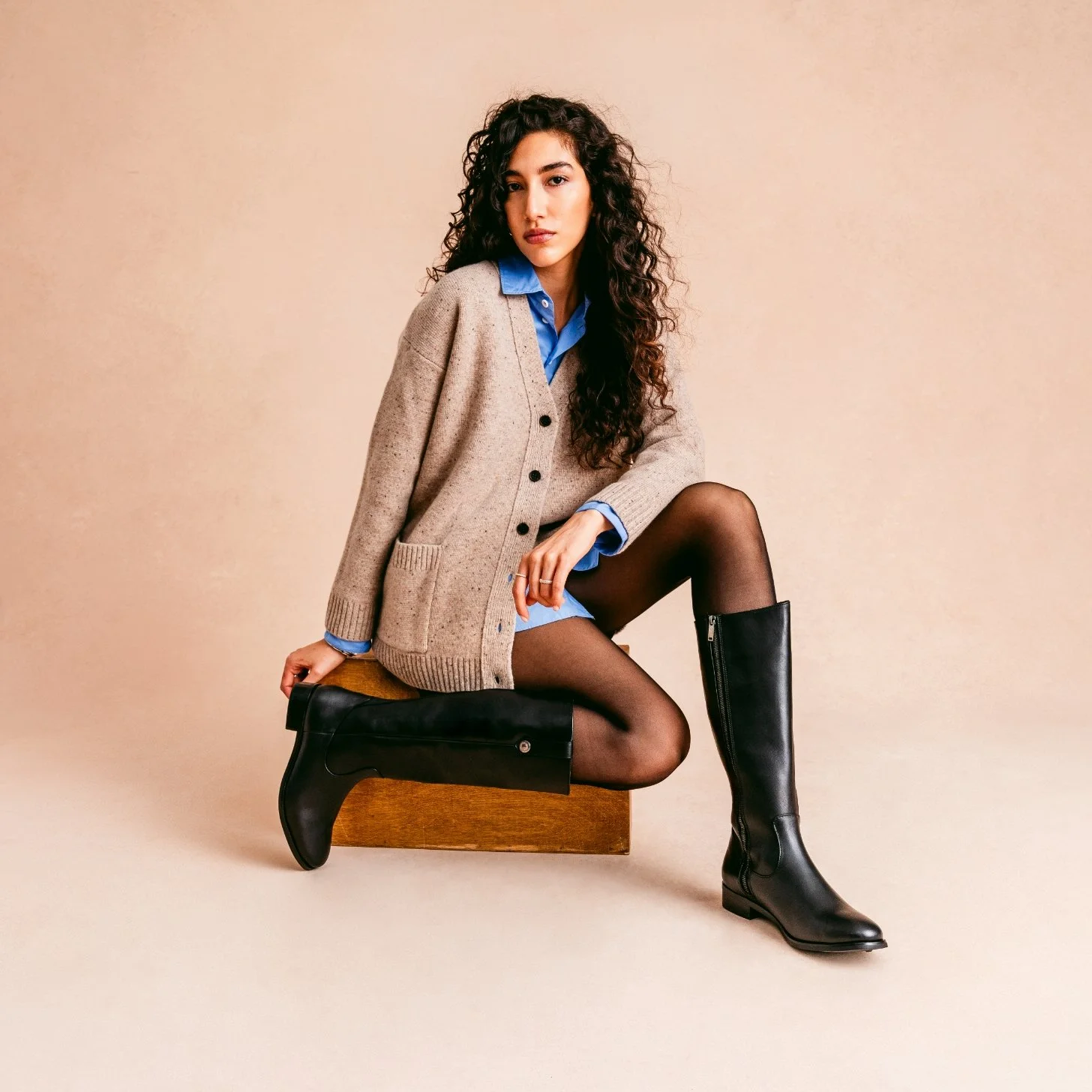 Young woman with curly dark hair wearing a beige cardigan, blue collared shirt, black tights, and tall black boots, sitting on a wooden block against a neutral background. View fullsize