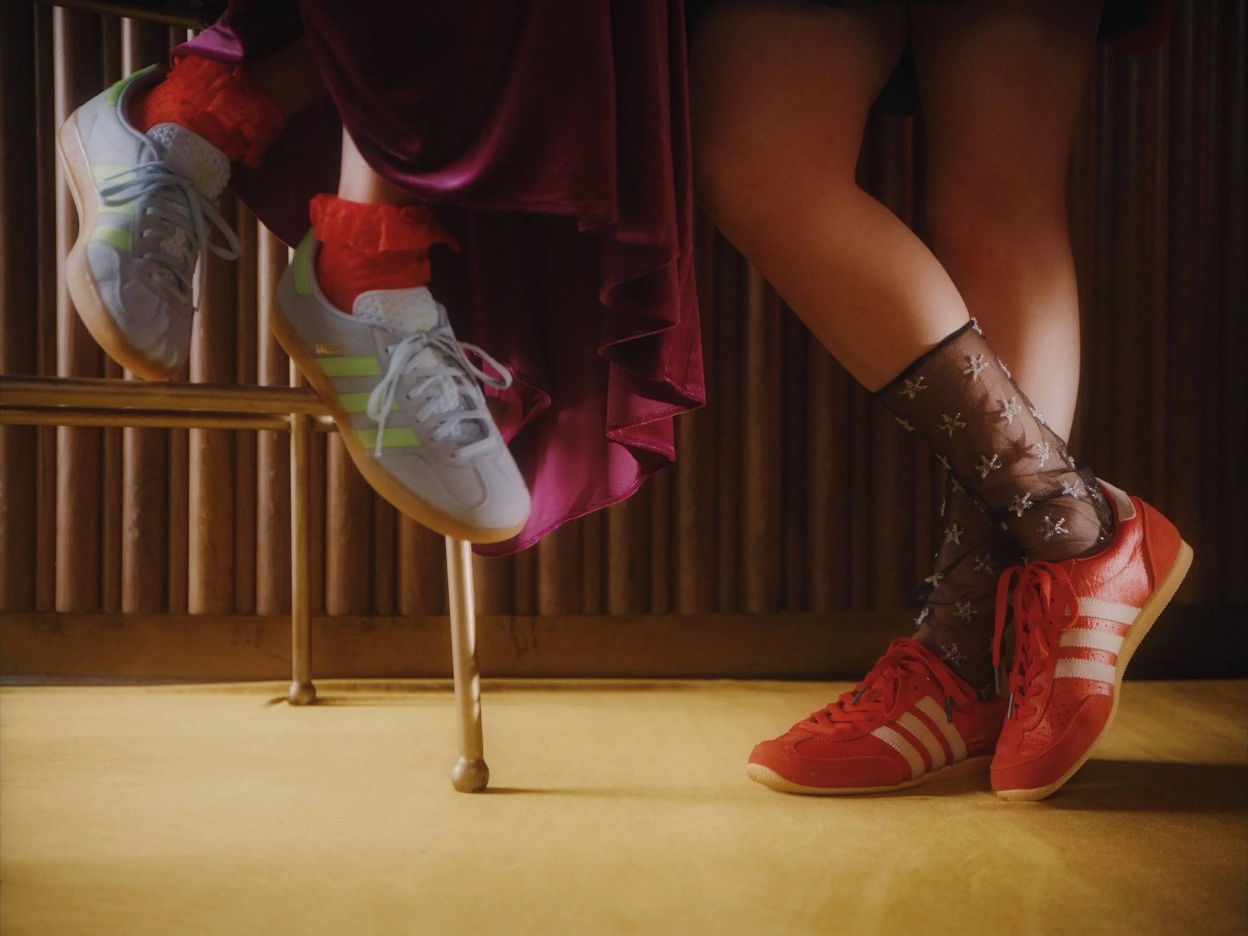 Close-up of a person sitting on a chair with crossed legs, wearing red athletic shoes, sheer black socks with star patterns, a burgundy skirt, and orange socks underneath. The background features wooden paneling.