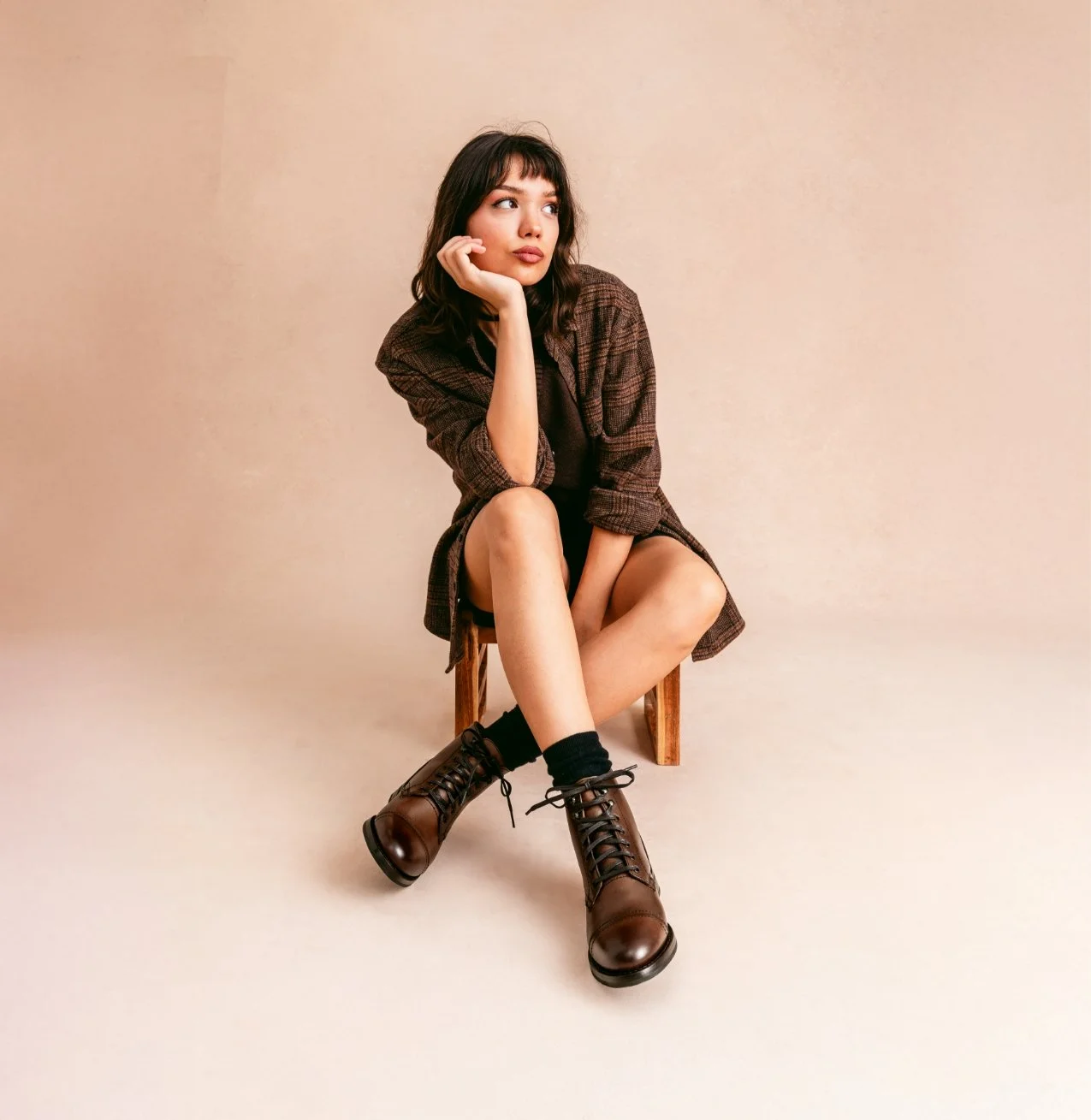 Young woman sitting on a small wooden stool, wearing a plaid jacket, black top, shorts, black socks, and brown combat boots, looking to the side with her chin resting on her hand.