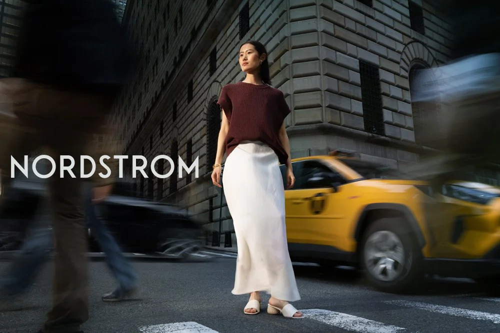 A woman in a brown top and white skirt standing on a city crosswalk beside a yellow taxi with tall buildings in the background, and the text 'NORDSTROM' overlayed.