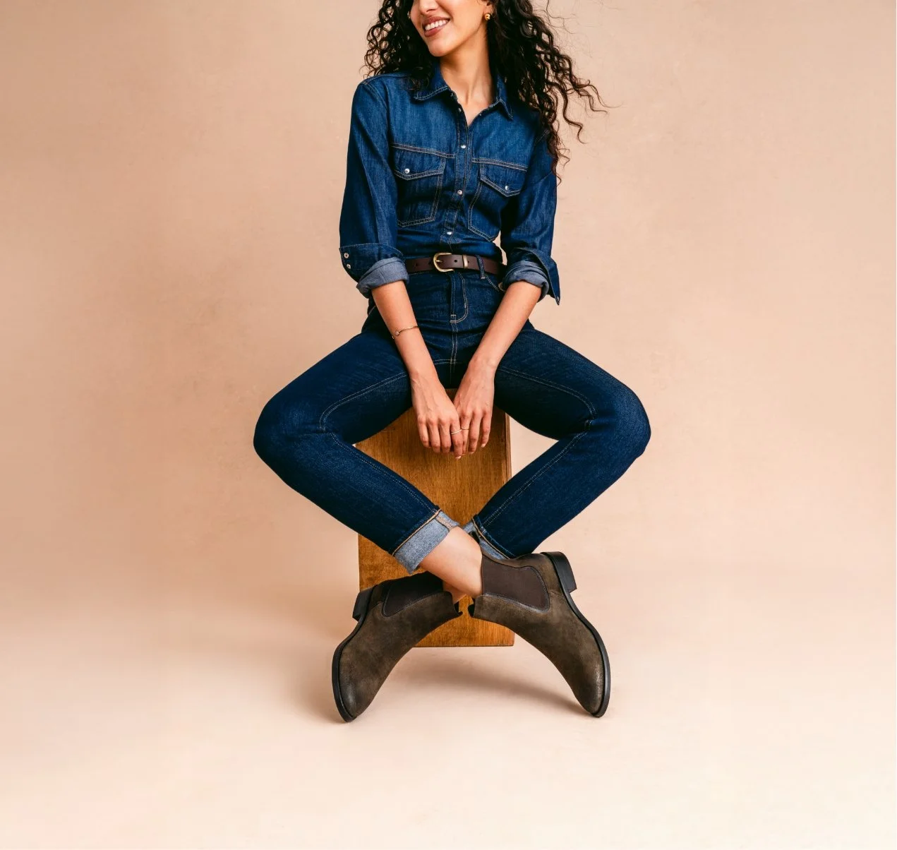 A woman sitting on a wooden box, smiling, wearing a denim shirt and jeans, with her legs crossed and feet in brown ankle boots, against a beige background.